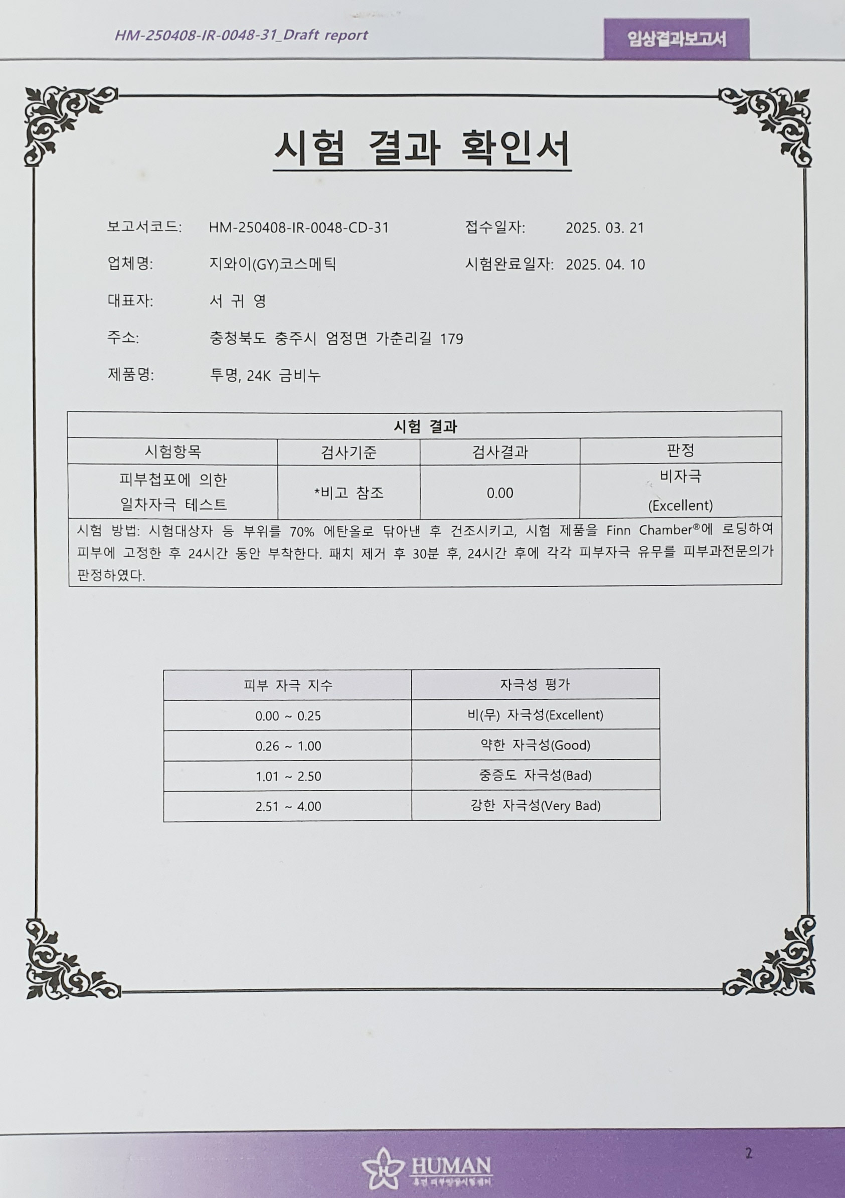 투명 금비누 시험성적서