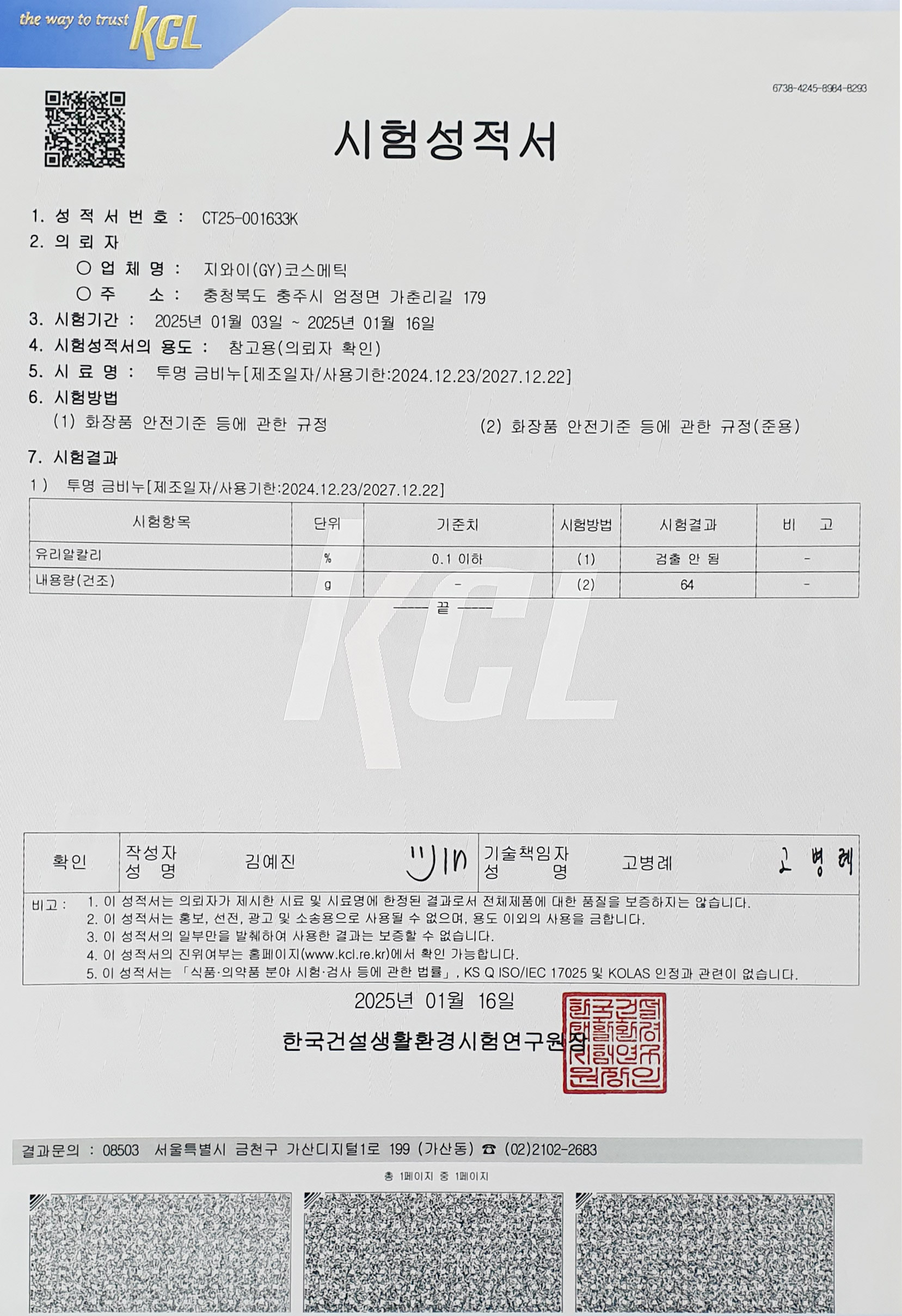투명 금비누 시험성적서